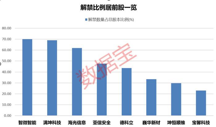从解禁比例来看,智微智能、满坤科技、海光信息的解禁比例均超60%,亚信安全、德科立、巍华新材、坤恒顺维等股的解禁比例也居前。