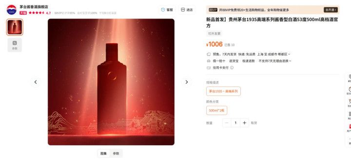 茅台1935新品上线,千元价钱带竞争再添变数。 《逐日经济新闻·将进酒》记者获悉,“百亿”大单品茅台1935本日在京东、天猫、抖音三大平台共5家店铺精致开启新品预售,订价为998元/瓶。 官方旗舰店截图 手脚白酒行业近幼年有的风光级大单品之一,茅台1935于2022年上市,当初订价为1188元,岑岭时被炒到1800元以上。两三年时分里,其赶快成长为茅台系列酒旗下的“百亿级”大单品,累计销售收入已接近300亿元,并助推茅台酱香酒公司在2024年营收打破200亿元大关。 茅台1935与第八代五粮液