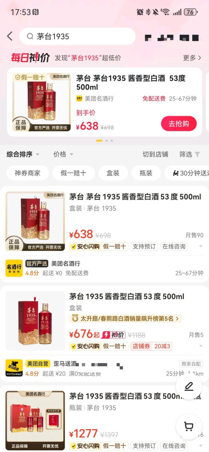 反不雅茅台1935,其官方电商平台标价约为800元/瓶,而在即时零卖平台上,大王人价钱区间已在638元/瓶至729元/瓶之间。