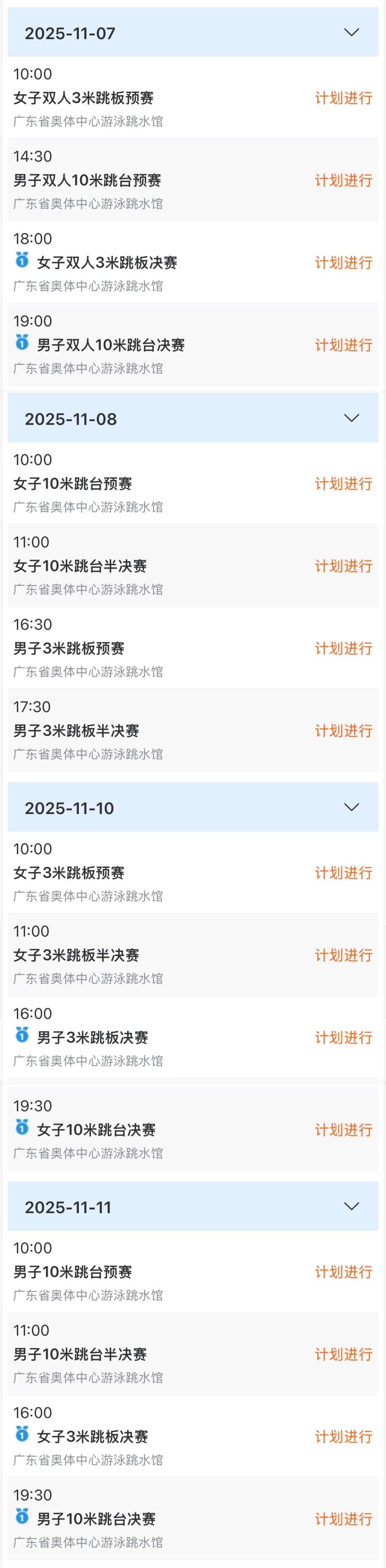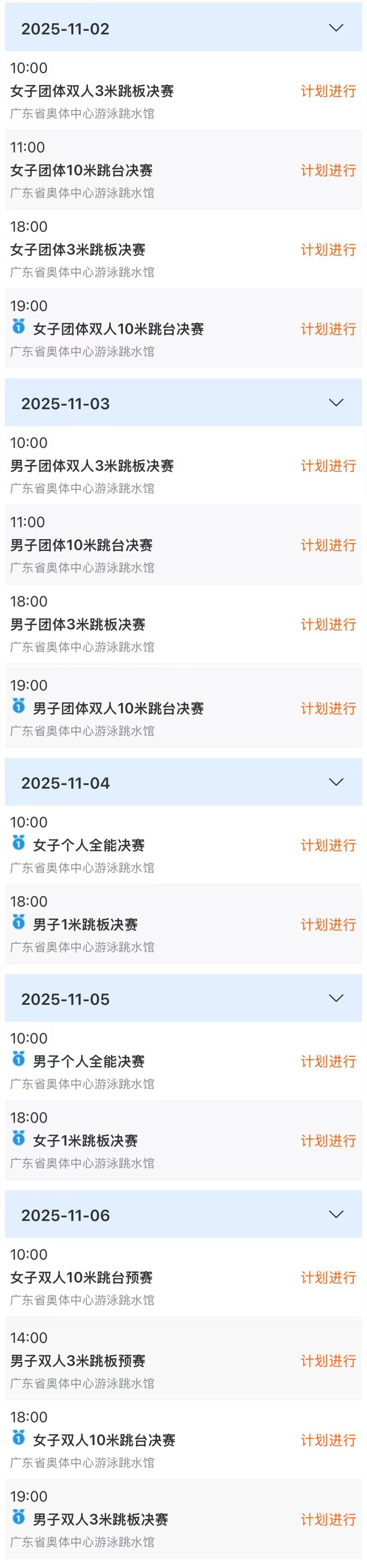11月6日上昼,将举行女子双东谈主10米跳台初赛,傍晚将举行该面容决赛。11月8日上昼,女子单东谈主10米跳台初赛和半决赛将举行,而决赛则将在十五运会开幕式之后的第二天,即11月10日晚间进行。